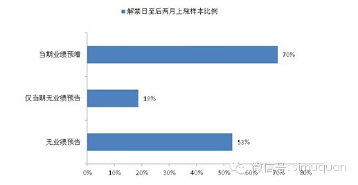 5、分组对照研究显示,解禁后的涨跌概率与上市公司当期业绩公告行为具有显著关联。当期业绩预增组上涨比例最高,当期无业绩预告组上涨比例最低,而从无业绩预告组上涨比例居中。