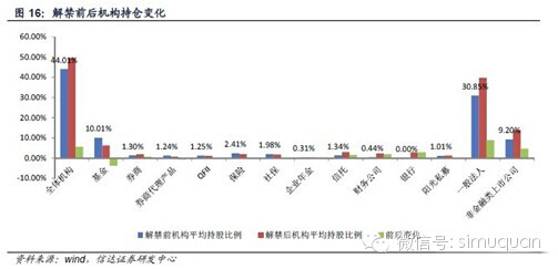 6、在各类型机构投资者中,解禁后基金的减持比例最高,而信托、一般法人及上市公司的持股比例反而上升。把各类机构按照减持比例降序排序,顺序是基金>企业年金>QFII>保险>社保>阳光私募>券商代理产品>非金融类上市公司>全体机构>一般法人>券商>信托>财务公司>银行。