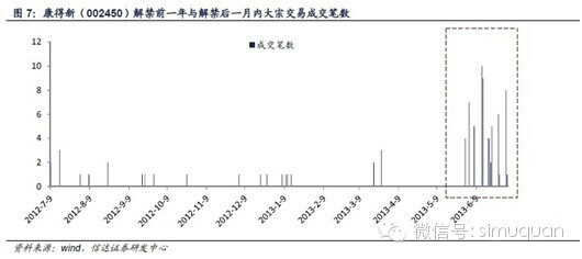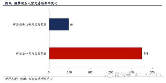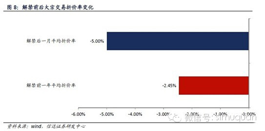 3、定增解禁后一个月内,大宗交易的频率是平常状态下的4.8倍;折价幅度是平常状态下的2倍。我们的研究数据显示,定增解禁之后一个月内是大宗交易的密集时期。具体而言,各增发项目解禁后一个月内,共计发生448笔股票大宗交易;而同样是这些发生大宗交易的公司,在解禁前一年内共发生大宗交易的笔数为1127笔,平均每月为94笔。也即是说,定增解禁后一个月内,大宗交易的频率是平常状态下的4.8倍。上述样本解禁前一年内的1127笔大宗交易(共27.5亿股)平均折价率为-2.45%;而解禁后一个月内的448笔大宗交易(共15.0亿股)平均折价率则为-5.00%。