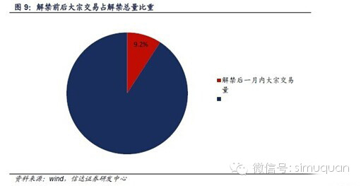 4、定增解禁后一个月内,大宗交易量占相关股票解禁总量的比重约为9%。在上述时期内,共有415只股票涉及到解禁,而其中94只在解禁后一个月内进行了大宗交易,交易数量占94只解禁总量比重为9.2%。