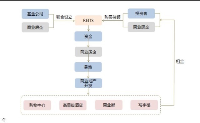 商业房企联合基金公司设立REITS在公开市场募集资金然后用于商业地产的开发培育获取租金收益,然后将租金收入以分红的形式分给投资者。这种情况下,商业地产企业把REITS作为一种融资渠道,优化了资本结构、缓解了资金压力。
