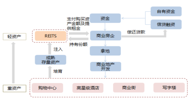 REITS对于商业地产企业运营模式最大的影响在于其提供了一种推出机制。商业地产企业首先进行以自有资金和信贷融资获得的资金进行商业地产的开发以及前期培育,等商业地产培育成熟获得稳定的租金收入后将成熟的存量资产打包设立REITS在公开市场出售部分份额回笼资金,本质上是一种类住宅开发模式,提高了IRR,缩短了投资回报周期,同时房企持有部分REITS份额享受每年的分红收益以及潜在的物业升值收益,整个过程实现了由重资产向轻资产的转变。