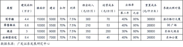 此外,我们对不同的商业物业类型(写字楼、零售物业、酒店以及出租型住宅)针对上述3种情况分别做了测算,测算模型以及测算结果如下: