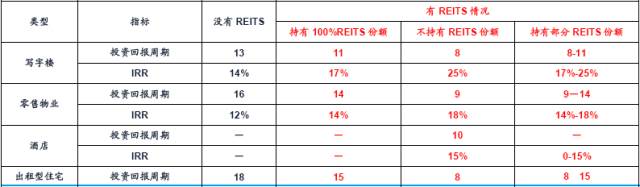 通过测算我们可以发现,在有REITS的情况下,商业地产企业通过将其所持有的商业物业(无论是写字楼、零售物业、出租型物业还是酒店)出售给REITS实现退市套现、回笼资金,进而提高了IRR和缩短了投资回报周期,而这也是REITS对商业地产企业最大的影响。