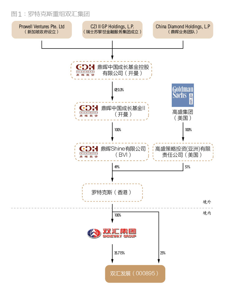 2007年10月6日,在罗特克斯完成对双汇集团的收购一年半左右之后,高盛在境外将其持有罗特克斯5%转让给了鼎晖Shine,二者在罗特克斯的股权比例由开始的51:49变成46:54,鼎晖Shine取得对罗特克斯控股权。
