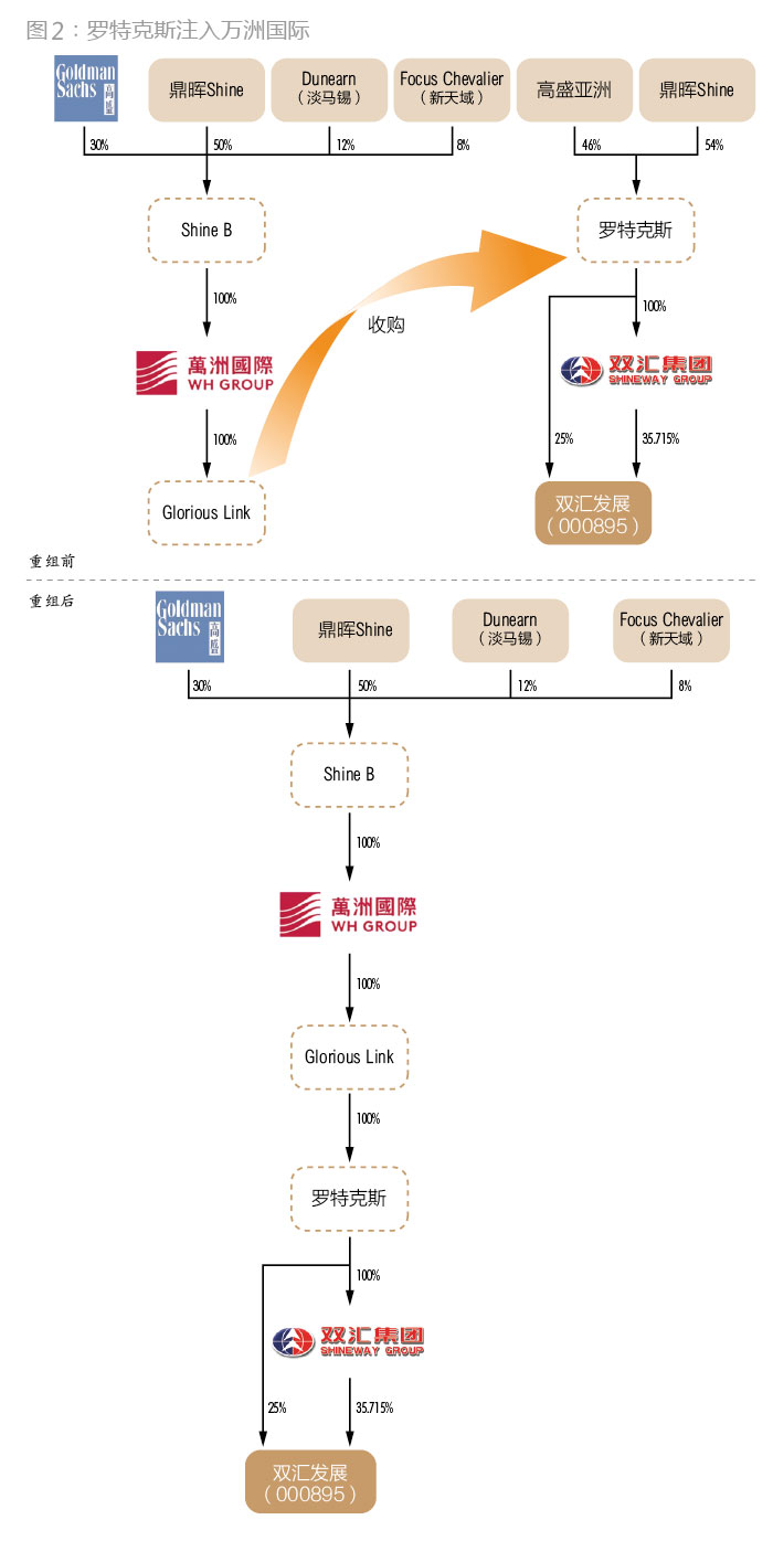 2007年10月15日,高盛将罗特克斯5%股权转让给鼎晖Shine后不到10天,万洲国际控制下的GloriousLink收购了二者持有罗特克斯的全部股权,由此将双汇集团资产整合到旗下(图2)。并且通过这一步的转让,高盛在收购双汇集团后短短一年半的时间内,持股比例由46%进一步下降到了30%。
