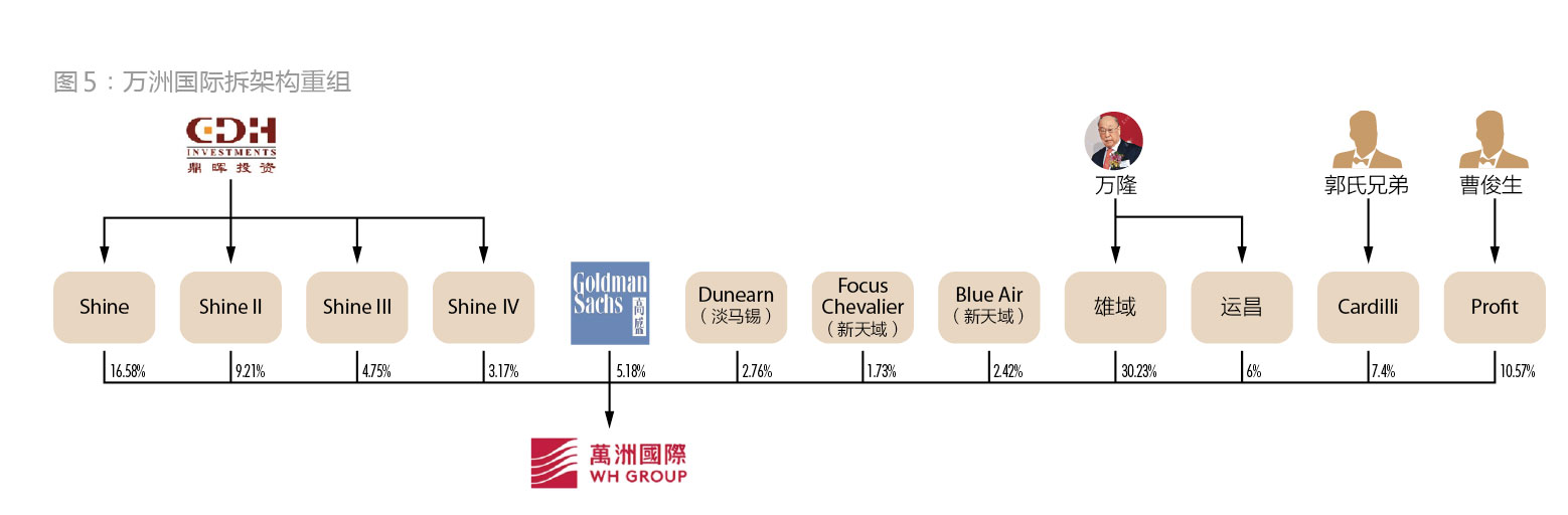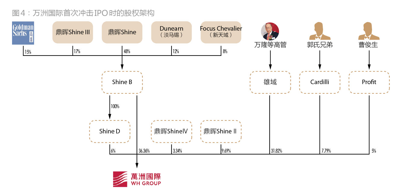 其次,ShineB所设万洲国际的股权也发生了变化:ShineB和Profit将其所持万洲国际部分股权向鼎晖设立的ShineD、鼎晖ShineⅣ、鼎晖ShineⅡ进行转让,郭氏兄弟控制的Cardilli也同时受让了极少股份,万洲国际上市架构初成(图4)。
