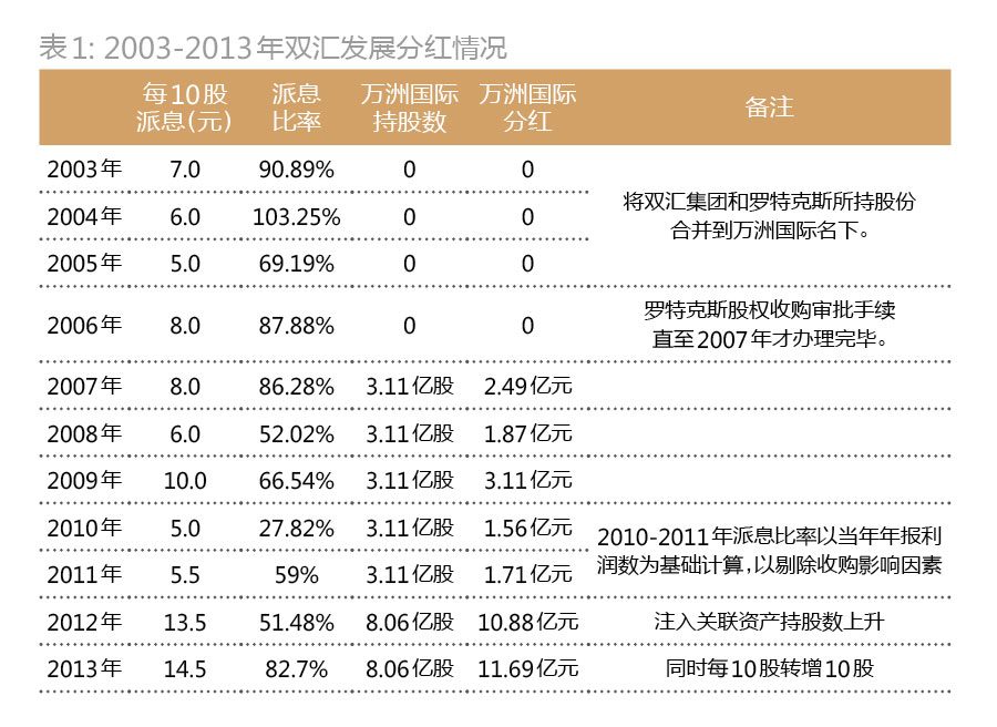 在2013年,为完成史密斯菲尔德收购资金的筹集,罗特克斯将其持有的双汇发展所有股份予以质押贷款。为偿还境外银行贷款,万洲国际、罗特克斯及双汇集团在贷款协议中向境外银行承诺,双汇发展将按不低于每年可分配利润70%的比例用于分红。双汇发展成为万洲国际一头名副其实的现金“奶牛”。