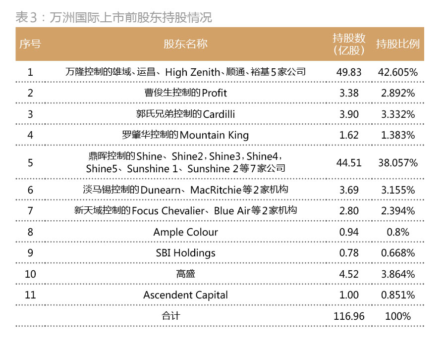 无论鼎晖增持万洲国际股份的真相如何,在受让了曹俊生和郭氏兄弟转让的大部分股份后,鼎晖通过其先后设立的7家持股持股平台累计持有万洲国际38.057%股权,但万隆此时也通过雄域公司等5家公司拥有万洲国际42.605%的股权,终于在控股地位上如偿所愿(表3)。但一方面,万隆持有的股份中一部分是股权激励股份,行权尚待时日,另一方面,即使全部行权,该比例仍低于以鼎晖为首机构投资者合计持有的49.79%股份。考虑到这些机构投资者利益高度一致,万隆在他们没有完全退出之前,依然不能掉以轻心,还需要在众多投资者中间“走钢丝”。