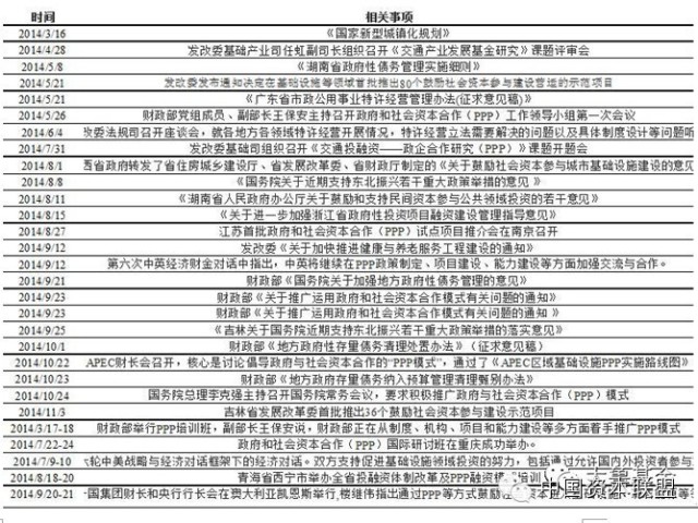 2014年APEC财长会议的闭幕,PPP在中国已然成了筹资模式的热门词语。2014年以来我国针对PPP模式出台的一系列相关政策一览表如下: