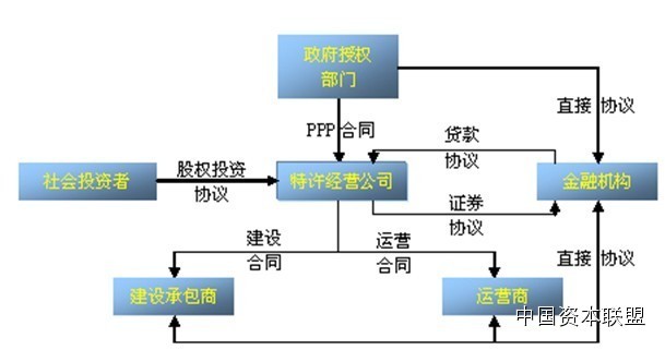 PPP典型的结构为:政府部门或地方政府通过政府采购的形式与中标单位组建的特殊目的公司签定特许合同(特殊目的公司一般是由中标的建筑公司、服务经营公司或对项目进行投资的第三方组成的股份有限公司),由特殊目的公司负责筹资、建设及经营。政府通常与提供贷款的金融机构达成一个直接协议,这个协议不是对项目进行担保的协议,而是一个向借贷机构承诺将按与特殊目的公司签定的合同支付有关费用的协定,这个协议使特殊目的公司能比较顺利地获得金融机构的贷款。采用这种融资形式的实质是:政府通过给予私营公司长期的特许经营权和收益权来加快基础设施建设及有效运营。