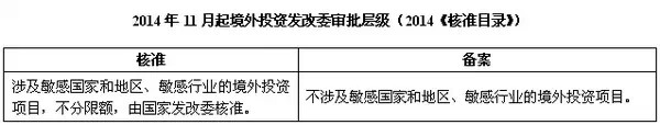 然而,距离9号令实施仅仅不到3个月,利好政策便再度传来。2014年10月31日,国务院开始实施《关于发布政府核准的投资项目目录(2014年本)》[7](以下简称“2014《核准目录》”)。2014《核准目录》规定,除涉及敏感国家、敏感地区、敏感行业的境外投资外,发改委立项一律简化为备案制。即:
