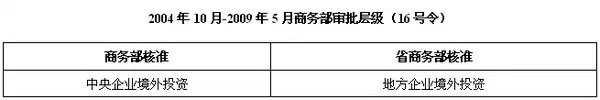 商务部核发《企业境外投资证书》的统一性文件最早见于2004年的《关于境外投资开办企业核准事项的规定》[8](以下简称“16号令”)。此时,为取得《企业境外投资证书》,无论何种项目,不论是否是中央企业或是地方企业都需要履行核准程序。核准程序是一种事前实质审查程序,商务部将审查投资项目内容、境内境外企业章程等,并要求提供外汇主管部门出具的外汇资金来源审查意见。从某种程度上来讲,此时商务部的职能与发改委和外管部门有些许竞合。