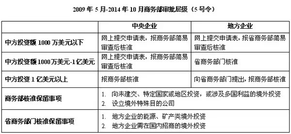 五年之后,2009年5月,《境外投资管理办法》[9](以下简称“5号令”)实施,取代了16号令的规定。5号令有三大革新。第一,尽管此时所有境外投资项目仍需商务部“核准”,但商务部对于中央企业1亿美元以下的境外投资及地方企业1000万美元以下的境外投资,均已大幅松绑为“简易审查”。实质审查受理后的审批时限为15个工作日(不含省商务部门初审10个工作日及征求使领馆意见的时间);而简易审查受理后仅需3个工作日便将核发《企业境外投资证书》。这对于中小型境外投资而言,极大提高了审批效率。第二,实质审查申请文件中不再要求提供外管部门的资金来源审查意见。但是,增加了《境外并购事项前期报告表》的规定,即并购类境外投资项目在签署生效协议前应向商务部报告。第三,网上“境外投资管理系统”正式上线,让文件递交更加高效、便利。