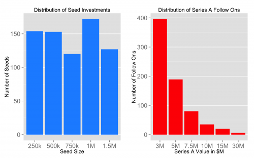 但是这些数据中还是有些有用的信息的。下面两张图表,左边是种子资金的规模分部,右边是A轮融资的规模分布。正如你所见,两者之间差别相当大。