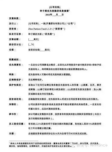 因此,尽可能的简化投资条款,在很多时候反而对创业者和投资人都相对有利。近年来,天使投资termsheet有逐步简化的趋势,IDG、真格基金等推出一页纸TermSheet,仅包含投资额、股权比例、董事会席位等关键条款,看上去一目了然,非常简单易懂。