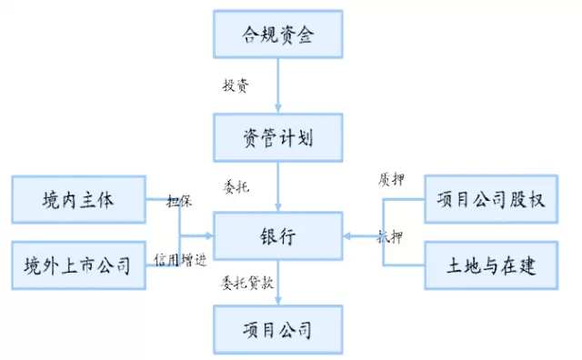 2资管计划为放款的主要通道,资管计划作为委托人,委托银行(作为受托人)以委托贷款的形式发放给项目公司,担保方式一般为项目土地及在建工程抵押,香港上市公司的国内主体提供连带责任担保,香港上市公司出具信用增进函。3通常情况下,为保障项目封闭运作,提高综合收益,一般由本笔业务的实际出资银行承担了委托贷款的受托人角色。同时,在委托贷款新规出台之前,相关抵押及担保可以直接出具给受托人,而非委托人(资管计划)。
