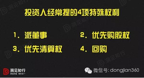 大家都知道一个说法叫“同股同权”,但股权投资者没有几个投资人会和你完全同股同权。投资人往往会要求一些特殊权利,实践中这些权利中有些可以和投资者谈判: