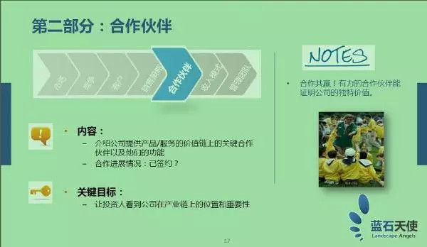 ? 第 7 页:你们已经做了什么(里程碑)——主要是为了表示你并不是拿着一个 idea 就来融资了,以及用已有的运营数据证明你们的这套思路是可行的,流程是可以顺下来的。不曾经过用户测试的产品不是好产品,更复杂的业务需要的也不只是用户的测试,而要与合作伙伴、上下游都形成对接,并且能自然获取更多用户。这些复杂的内容,真的做到了就比什么设想都强。