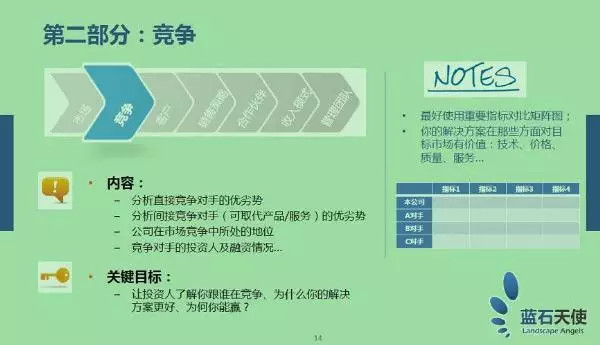 ? 第 5~6 页:为什么是你能解决这个问题(优势、竞品分析)——你的核心竞争力在哪儿,为什么别人都没做就你做了,为什么别人都没做成就你做成了,为什么别人以后都会被你超越?如果你并没有能够显然超越别人的优势,之前空谈市场都是白搭。