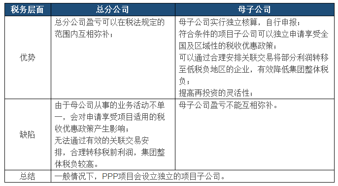 PPP模式下,经营者可以借助以上的相关税收优惠进行规划、积极争取国家出台的优惠政策,对于实务中涉及到的子公司与分公司的选择问题,分析如下: