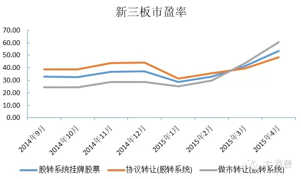新三板市盈率已逐步走高,从去年的平均30倍到今年3月的50多倍。而其中又以做市转让的市盈率为高(目前已经超过60倍)。从上图中也可看出,做市转让的股票提升幅度也是最大的,翻了一倍有余。