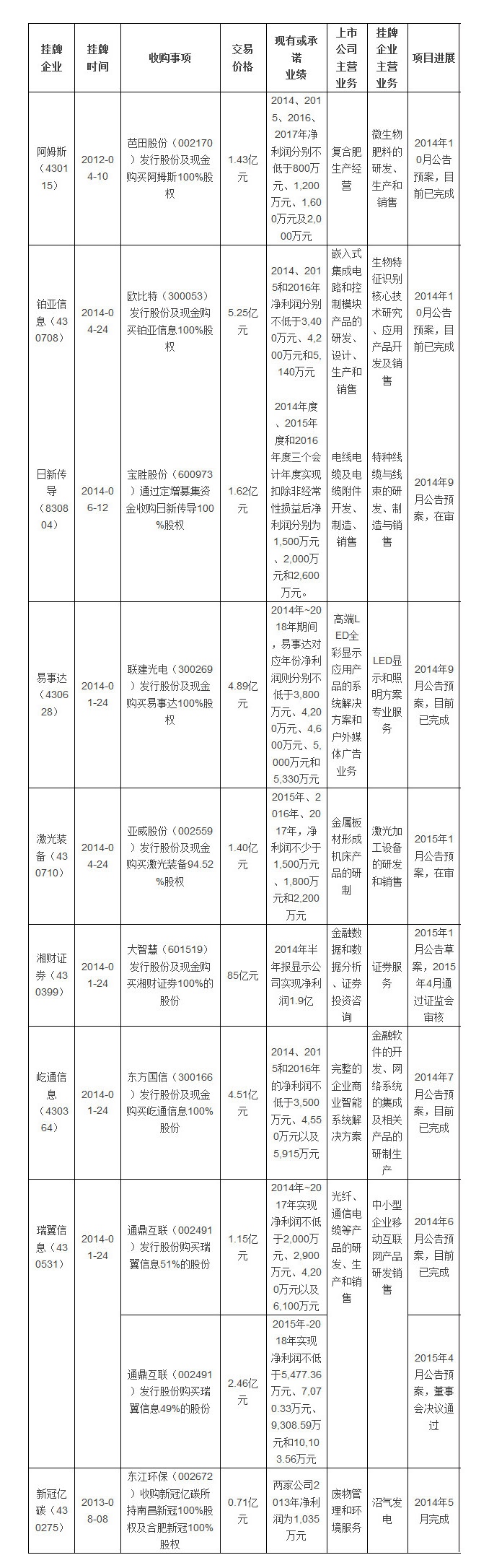 截至2015年6月底,新三板挂牌企业被A股上市公司收购情况如下: