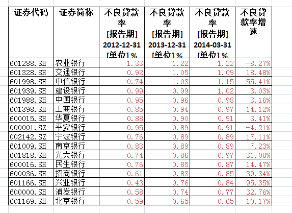 首先是不良贷款率:不良贷款率指金融机构不良贷款占总贷款余额的比重。不良贷款是指出现违约的贷款。一般而言,借款人若拖延还本付息达三个月之久,贷款即会被视为不良贷款。银行在确定不良贷款已无法收回时,应从利润中予以注销。预期贷款无法收回但尚未确定时,则应在帐面上提列坏帐损失准备。下图是各银行的数值: