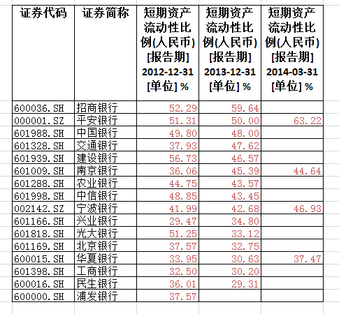 然后是短期资产流动性比率: 短期资产流动性比率指银行及时满足其各种资金需要和收回资金的能力。银行在经营中,一方面为了获取最大利润,总是希望更多地贷款和投资,并倾向于运用期限长、利润大的资产;另一方面,负债的不稳定,又要求银行有足够的流动资金来应付经营过程中的流动性需要,以避免发生流动性风险。一旦指标超过了警戒线,社会公众可能会对银行失去信心,处置不当最终会使银行失去清偿能力,并导致银行破产。这就是说商业银行在经营活动中时刻面临着流动性风险,而且流动性风险是引发商业银行经营风险乃至整个金融风险的关键所在。监管层认为银行的流动性比例指标应大于等于25%。计算公式为:流动性资产(1个月内)÷ 流动性负债(1个月内)×100%