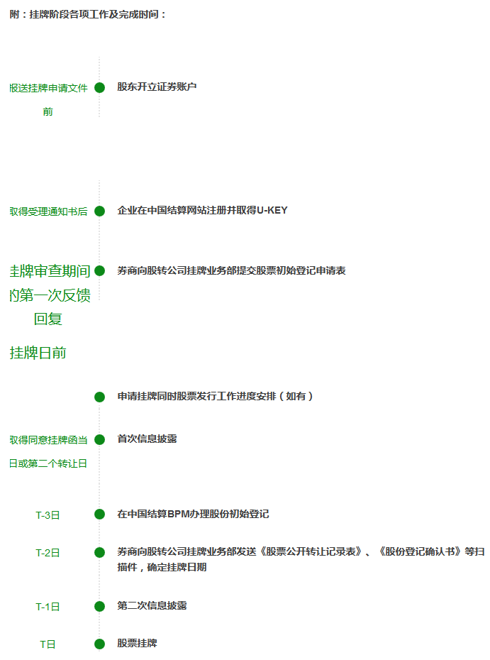 申请挂牌公司取得中国结算北京分公司出具的《股份登记确认书》的当日11时前,将《股份登记确认书》、《公开转让记录表》(加盖主办券商和申请挂牌公司公章)扫描件、《做市商持有证券信息表》(如有)提交至全国股转公司挂牌业务部,确定公司挂牌日期(挂牌日为取得《股份登记确认书》当日起算的第三个转让日)以便办理股份进入交易系统的操作。