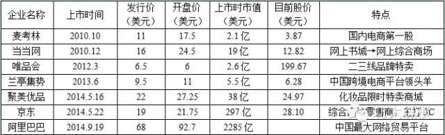从顶着“国内电商第一股”头衔的麦考林到“史上最大IPO”的巨头阿里,先后已经有麦考林、当当、唯品会、兰亭集势、聚美优品、京东、阿里共7家电商进入美国上市的资本大盘中,颇有一种七剑下天山的磅礴气势。