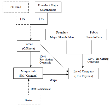 (1) 控股股东(以及PE,若有PE 参与,下同)向上市公司提出合并方案,提议由控股股东持有的控股公司(Parent)下属合并实体(Merger Sub)(以上各方合称为“收购方”或“要约方”)与上市公司合并;控股公司以一定的价格收购所有非关联股东持有的股份。不同意合并的公众股东将有权申请评估,按评估价格向控股公司出让其所持上市公司股份。