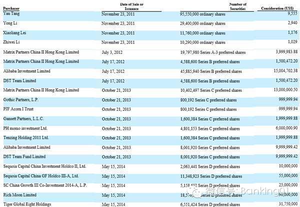 其中,Alibaba Investment Limited在2012年7月获得45 ,885,940股B类股,投资金额为1500万美元,2013年10月再获得8,001,920股C类股,投资金额为1000万美元。