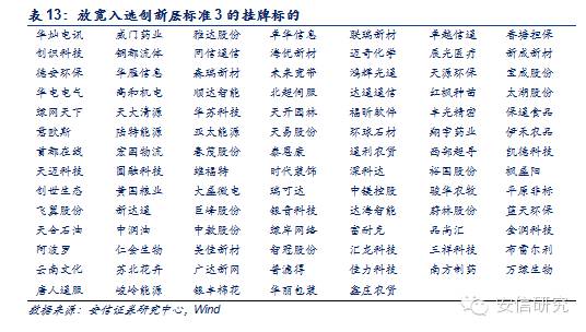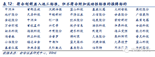 根据分层方案,分层将于2016年5月正式实施,“根据已挂牌公司2015年年报披露截止日(2016年4月29日)后,全国股转系统根据分层标准,自动筛选出符合创新层标准的挂牌公司”。当前时点,尚未达到入选创新层条件的挂牌企业仍有冲击可能。鉴于完成1次融资及新增1-2个做市商可能是相对较易达成的条件,我们倾向于从二个维度来筛选冲击创新层可能的标的股票池,1)已达到入选创新层三个条件,但是不符合流动性标准;共筛选出56个投资标的;2)基本符合标准3的入选条件,适当放宽市值要求到5亿,做市商数量至少4家;共筛选出96个投资标的。