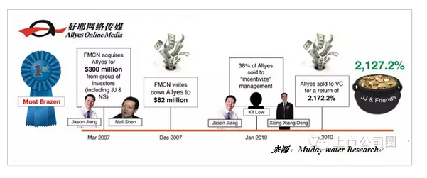 在好耶MBO完成7个月后,2010年8月2日,分众传媒宣布将好耶网络62%的股权以1.24亿美元卖给私募基金银湖资本,按照这一价格,分众传媒对好耶的总估值达到2亿美元,相比于MBO时对好耶的估值溢价4.7倍。分众传媒MBO好耶网络的38%股权价值7600万美元,“江南春和他的朋友们”在短短7个月内获利6270万美元,盈利幅度高达4.7倍。按照Muddy Waters的描述,这一交易使得江南春和他的朋友们的内部年化收益率超过21倍,而同时导致股东损失高达1.596亿美元。