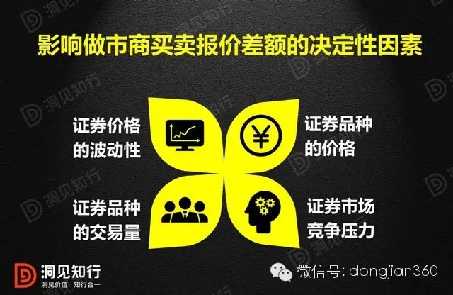 新三板做市商对做市股票进行双向报价,不但可以获得交易佣金,还可以靠买卖价差获取收益。而影响做市商买卖报价差额的决定性因素主要有: