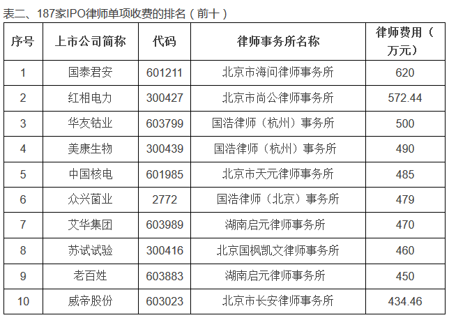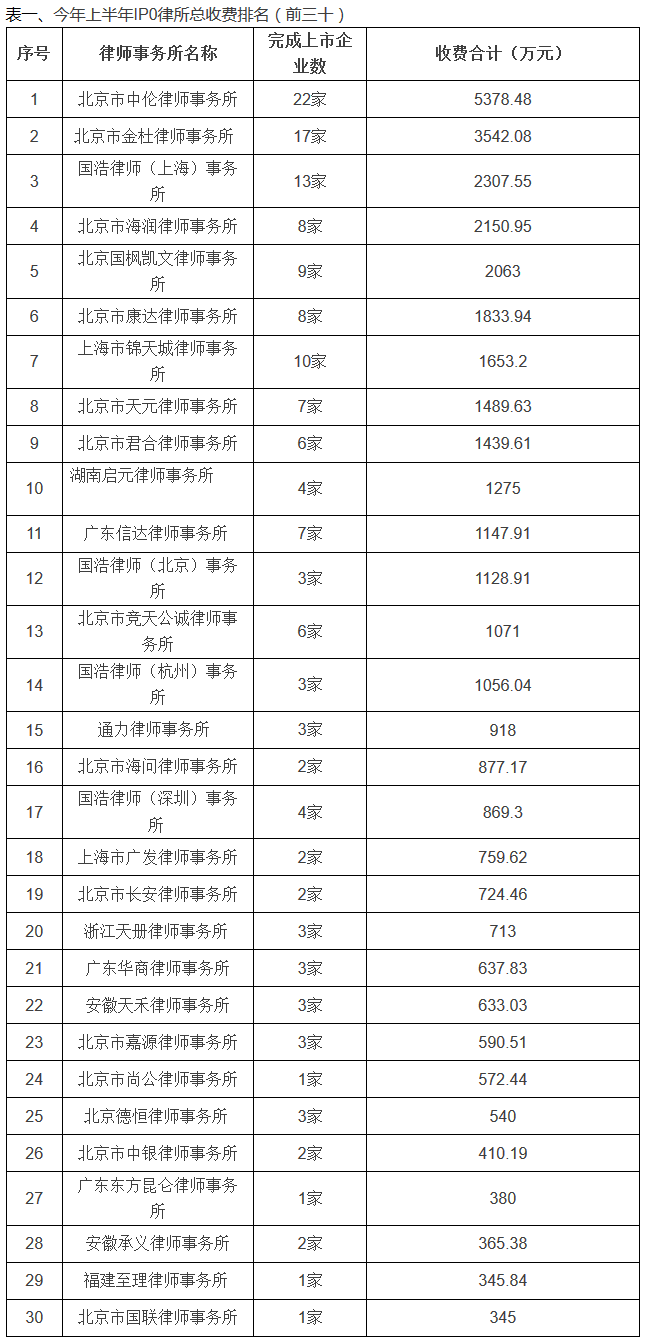 2015年上半年,上交所、深交所共有187家IPO公司完成上市,其中,上交所78家,深交所中小板35家,创业板74家。52家律师事务所提供法律服务。律师费收费总额前五甲分别为:北京市中伦律师事务所收费5378.48万元、北京市金杜律师事务所收费3542.08万元;国浩律师(上海)事务所收费2307.55万元;北京市海润律师事务所收费2150.95万元;北京国枫律师事务所收费2063万元。