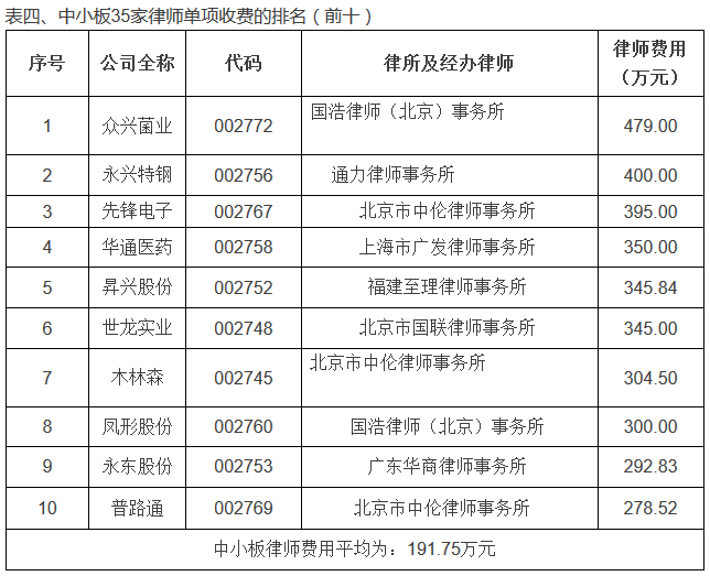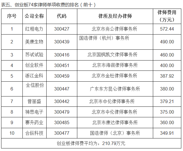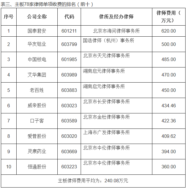 单个项目律师费收费最高的为国泰君安IPO项目,单项创收620万元。经统计,主板律师费用平均为:240.08万元,中小板律师费用平均为:191.75万元,创业板律师费平均为:210.79万元。律师费统计具体情况如下: