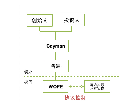 庄明浩介绍,VIE结构大概是这样的:创始人和投资人出资在境外设立一家企业A,出于避税和躲避监管的考虑,企业A一般设在开曼群岛(Cayman)等地;而后出于控制等其他因素考虑,A会在香港设立一家企业B,通过B控制一家在国内的企业C——这家C就是传说中的WOFE(外商独资企业)。