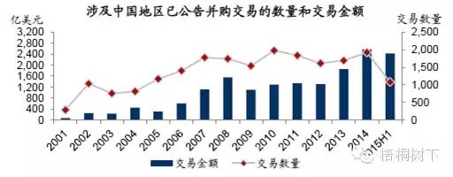 近几年中国并购市场继续保持持续升温的热度: 2015年上半年中国并购市场共公告交易1,082起;披露金额的并购共涉及交易金额2,424亿美元,达到中国并购市场半年度最高值。对比2013、2014年公告交易数量分别为1,691起、1,918起,总交易金额分别为1,850亿美元、2,567亿美元,交易金额和数量均有所增长。此外,已公告的单笔并购交易平均交易金额由2013年的约1.09亿美元上升至2.24亿美元,增幅超过100%