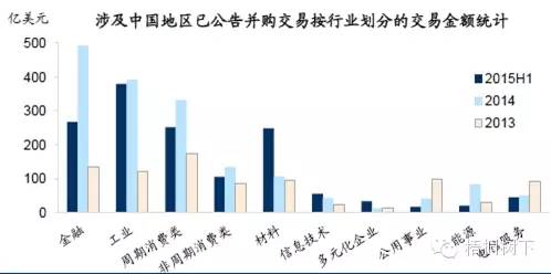 ?经统计,2013年至2015年上半年公告的涉及中国地区并购交易中,以交易金额论,金融、工业行业的并购交易火爆。