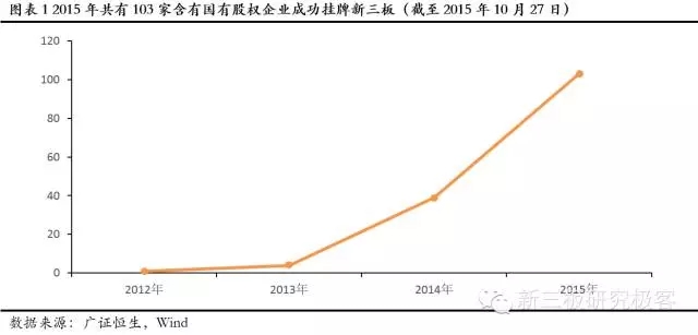 新三板一直致力于为中小微型企业提供良好的非上市股份有限公司股权交易平台,从一开始中关村园区试点到现在全国范围内的符合标准的企业均可申请挂牌。截至2015年10月27日,共有3852家企业在新三板上挂牌。根据Wind数据库资料显示,这其中有147家国有企业。这147家国有企业中,有103家是在2015年挂牌新三板的。