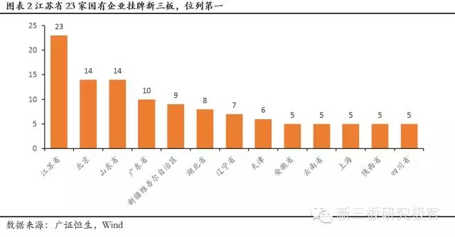 截至2015年10月27日,中国内地31个省级行政区域中,仅有宁夏回族自治区与西藏自治区两地没有国有企业挂牌新三板,基本实现全国各区域的覆盖。所有省级行政区域中,国有企业成功挂牌新三板最多的为江苏省,以23家的数量遥遥领先;北京与山东省则同时以14家并列第二。