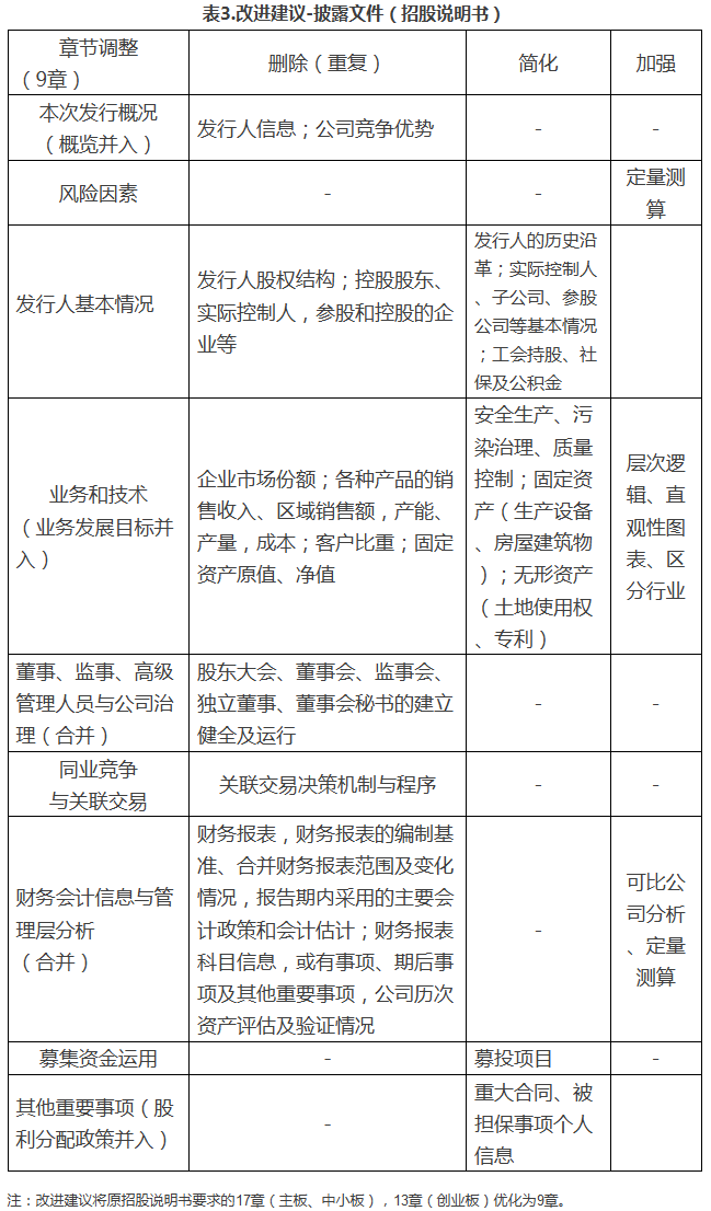 注:改进建议将原招股说明书要求的17章(主板、中小板),13章(创业板)优化为9章。