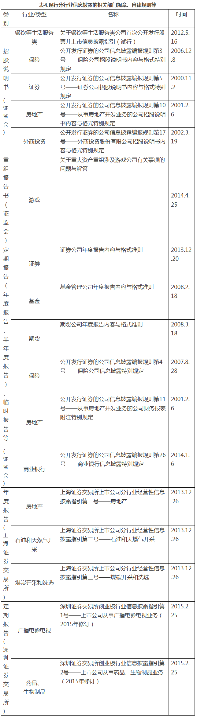 此外,根据新兴产业特点构建分行业的招股说明书披露准则。具体做法上,可借鉴现行证监会对餐饮等生活服务类、保险、证券、房地产领域招股说明书制定特别规定,以及沪深交易所对房地产、石油和天然气开采、煤炭开采和洗选、广播电影电视、药品和生物制品等行业上市公司年报分类披露的作法[5],在保持信息披露体系稳定的同时,及时根据市场变化增加新行业、新业务的信息披露要求,提高披露针对性。待条件成熟后再推广到全行业,与上市公司的行业监管对接。