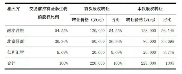 注:(1)在本次交易中,北京晋商及仁和汇智取得的对价为股份。北京晋商及仁和汇智在本次交易实质上是为上市公司提供过桥融资,且其持有圣泰生物股权的时间较短,因此北京晋商及仁和汇智以平价转让圣泰生物股权给上市公司;(2)融泰沣熙本次取得的对价为现金,不具备股权对价的潜在升值空间,且融泰沣熙在本次交易中为上市公司提供过桥融资,其投资者寻求一定回报,融泰沣熙转让圣泰生物股权的依据,系以前次融泰沣熙取得圣泰生物54.55%股权成本120,000万元的基础上,额外增加8,000万元作为融泰沣熙的固定回报。