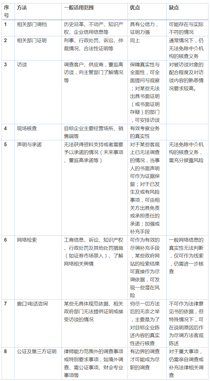 一文看懂并购重组中法律尽职调查的操作要点 来源:智合法律新媒体 作者: 日期:2017-09-20 法律尽职调查的基本方法 合理与成熟的尽调方法,既能够促使法律尽调标准化,也能在一定程度上保障尽调质量,合理规避执业风险。 就此,本文总结了几种常用的尽调方法(不包括目标企业提供基础资料),并对其适用范围,优劣等予以比较。其中,1-6项在并购项目中都会涉及,7-8项不常用。 2/2 首页 上一页 1 2