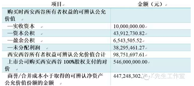 本次交易定价以收益法评估值为基础,经交易双方协议确定交易价格为54,600.00 万元。截至评估基准日2014 年12 月31 日,西安西谷账面净值产6,175.64万元,资产基础法下净资产评估值为9,875.18 万元,收益法下净资产评估值为54,613.24 万元,较资产基础法下净资产评估增值高出44,738.06 万元。该差额体现西安西谷在细分市场拥有的行业经验、销售网络、客户资源、业务资质以及专业服务等资源的价值,上述资源价值或无法从西安西谷整体价值中分离或划分出来,或评估机构在资产基础法评估结果中未对上述无形资产进行单独评估作价,形成本次交易的商誉。