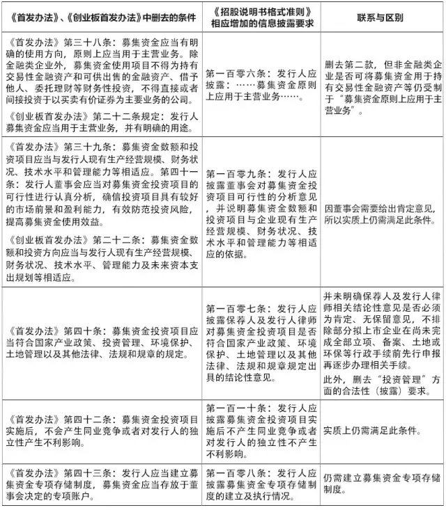 就修订后的《首发办法》和《创业板首发办法》删除的“募投资金运用”相关规定,修订后的《招股说明书格式准则》相应地提出了具体的信息披露要求。如下表所述,我们理解,通过修订后的《招股说明书格式准则》的相关披露要求,就原《首发办法》、《创业板首发办法》募集资金运用相关发行条件中的大部分要求,发行人在申请首次公开发行前仍需满足,且因发行监管部门在审核首发申请时对此不再进行实质判断,发行人及相关中介机构在进行判断及信息披露时应更加审慎。