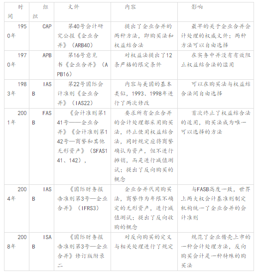 国外企业合并会计处理规范的变迁,大致经历了三个阶段:首先是权益结合法与购买法并存的阶段,该阶段两种方法的并存使大多数企业选择权益结合法,从而避免商誉的确认及其摊销;第二阶段是购买法阶段,该阶段终止了权益结合法的适用,购买法成为唯一可以选择的企业合并方法。第三阶段是反购买会计法的产生,随着国际上反向并购的浪潮兴起,尤其是美国2000年股市崩盘以后,IPO的窗口几乎是关闭的,借壳上市成为上市的主要渠道,反向购买法的产生是对该种特殊企业合并类型的会计处理方法的规范。